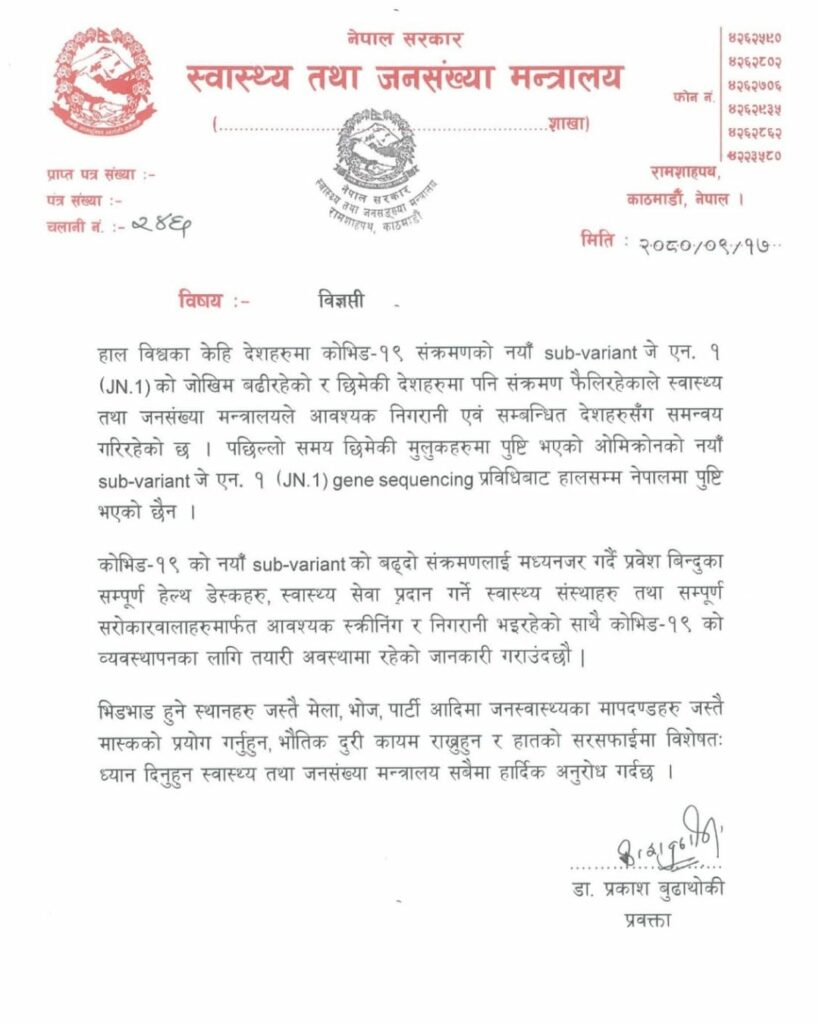 कोभिड–१९ को सब भेरियन्ट जेएन १ (JN1) को जोखिम बढेको भन्दै सतर्कता अपनाउन स्वास्थ्य तथा जनसंख्या मन्त्रालयले विज्ञप्ती मार्फत आग्रह गरेको छ ।